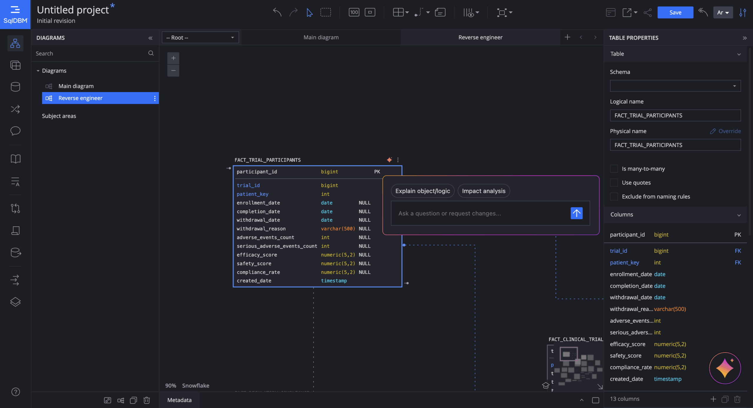 SqlDBM Copilot is an AI assistant built directly into the data modeling environment. Instead of acting as an external chatbot, it lives inside the modeling workflow, understands your projects, and works with your existing schemas, objects, and metadata. With it, you can move faster from ideas to models, automate repetitive work, and keep documentation and governance in much better shape.