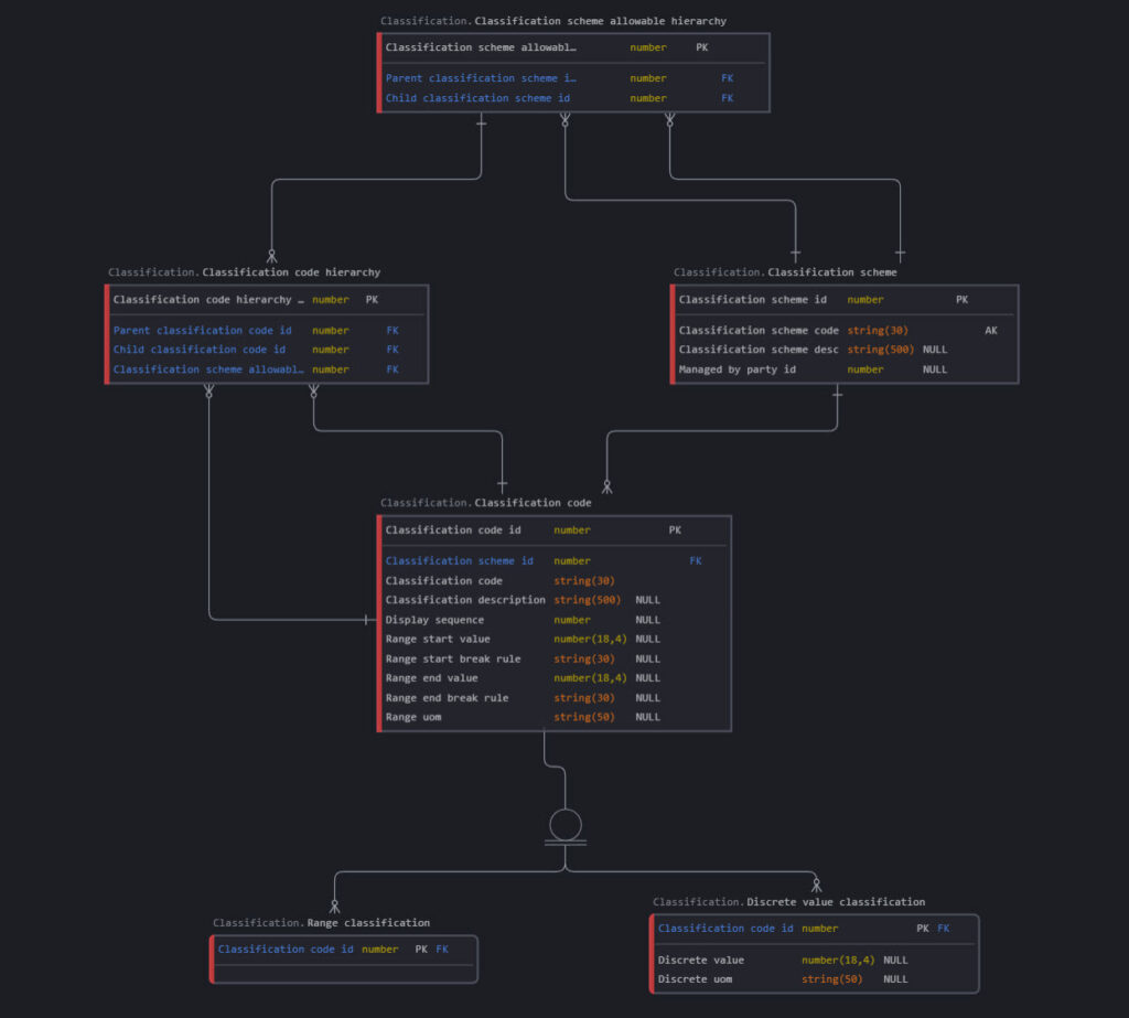 The pattern introduces Classification Schemes (systems of categorization, such as industry codes, risk ratings, and status codes), Classification Codes (the individual values within each scheme), and a Classification Code Hierarchy that organizes codes into parent-child trees within and across schemes. It supports both discrete value classifications and range-based classifications, making it equally suitable for categorical data (e.g., product categories, customer segments) and numeric ranges (e.g., tax brackets, age bands, credit score tiers). The scheme’s allowable hierarchy structure even governs which classification schemes can relate to one another, providing a metadata layer for managing your reference data governance.