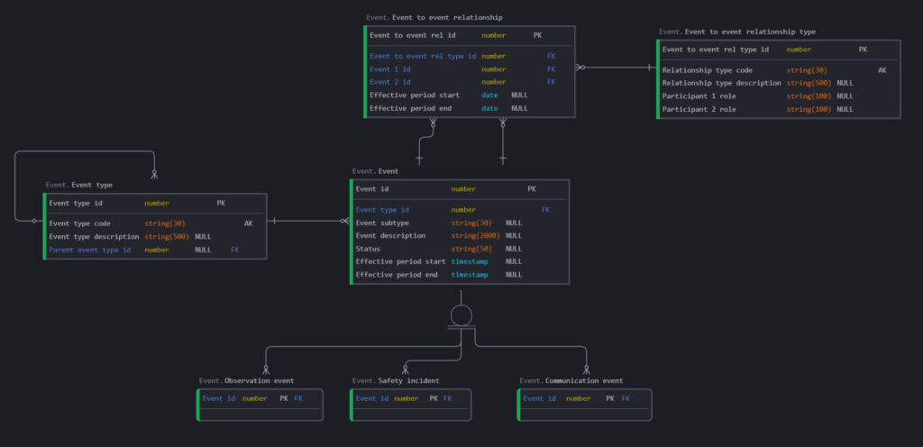 The pattern supports hierarchical classification of event types, event-to-event relationships (capturing causal chains, escalations, or sequences of related events), and subtypes for domain-specific event categories, such as Observation Events, Safety Incidents, and Communication Events. The effective period tracking uses timestamps rather than dates, accommodating events that need to be recorded with precision. This pattern is invaluable for audit trails, incident management, compliance tracking, customer interaction histories, and any domain where understanding what happened and when is central to the business.