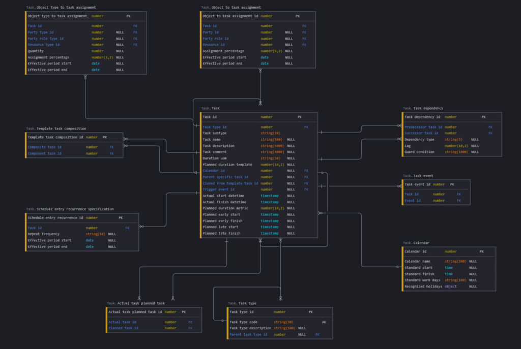 Template Tasks represent standard workflow specifications — the reusable process definitions that describe how work should be done. Specific Tasks are the actual work to be completed, cloned from templates and assigned to specific parties and resources. The pattern includes comprehensive scheduling support (planned early/late start and finish, actual start and finish), task dependencies with predecessor/successor relationships and lag times, calendar integration for work scheduling, recurrence specifications, and the ability to link tasks to triggering events. The object-to-task assignment structure supports assigning both individual parties and party role types, making it suitable for both named resource allocation and role-based staffing models.