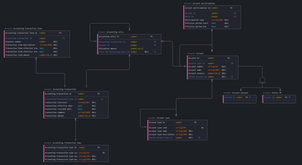 The pattern separates the Account (with its type hierarchy and balance tracking) from the Accounting Transaction (with its line items and entries). It includes Account Participation, linking accounts to the parties that own or manage them, and the Accounting Entry structure that supports proper double-entry allocation across accounts. The pattern also accommodates account hierarchies through self-referencing relationships, enabling you to model parent-child account structures, chart of accounts rollups, and consolidated reporting views.