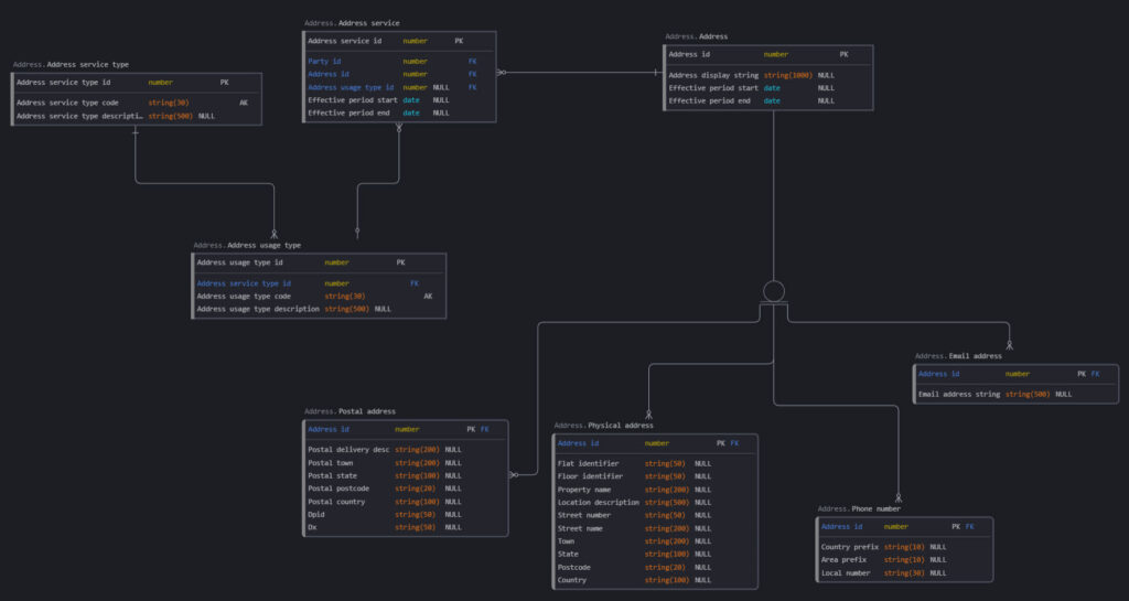 The pattern distinguishes among physical addresses, postal addresses, email addresses, and phone numbers—each with its own attributes—while unifying them under a common Address entity. It introduces the concept of an Address Service, which links a Party to an Address with a specific usage type (billing, shipping, home, work) and effective dates. This means you can track when a customer changed their mailing address, maintain multiple active addresses for different purposes, and support the full range of address service types your business requires.