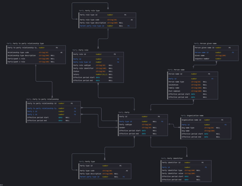 What makes this pattern especially powerful is its extensibility. The foundation supports recording inter-relationships between parties—employment relationships between a person and an organization, ownership hierarchies between holding companies and subsidiaries, parent-child relationships between individuals, and any other party-to-party connection your business needs to track. If your organization interacts with customers, employees, vendors, regulators, or any combination of stakeholders, this pattern provides a robust starting point.