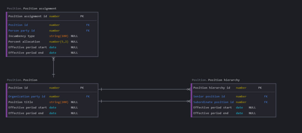 The pattern separates the Position (a defined role within an organization, such as “CFO” or “Senior Developer”) from the Position Assignment (the assignment of a specific person to that position, including the incumbency type and percent allocation). The Position Hierarchy captures reporting relationships between positions — not between people — allowing you to maintain a stable org chart even as individuals come and go. Effective period tracking across both positions and assignments enables you to model organizational changes over time, support future-dated restructuring plans, and maintain a complete history of how your organizational structure has evolved.