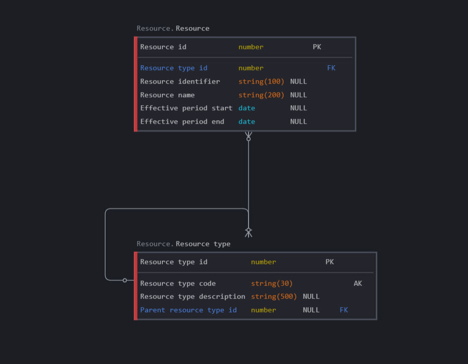 The pattern provides a clean type-driven structure with a Resource entity linked to a hierarchical Resource Type classification. Each resource carries an identifier, a name, and effective period dates for lifecycle management. While compact, this pattern serves as the anchor point for more complex structures — resources can be assigned to tasks (as shown in the Task pattern), allocated to positions, associated with locations, and linked to maintenance agreements. Its simplicity is intentional: it provides a stable core that you can extend to meet your specific asset management requirements.